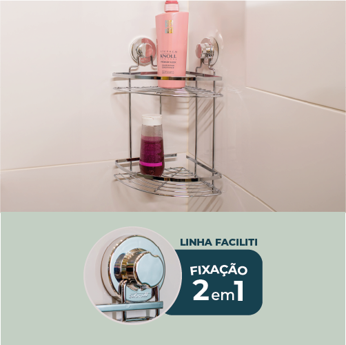 A Cantoneira Dupla Faciliti com Ventosa garante melhor aproveitamento do espaço e mantém shampoos, cremes e sabonetes organizados. A instalação é rápida, sem sujeira e dispensando o uso de ferramentas e furadeira.