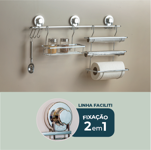 Este kit contém uma barra de 70cm, três ganchos multiusos, um porta rolo triplo e um porta condimentos.