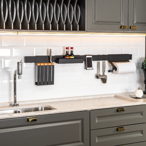 O Kit é composto pela Barra para Suporte Master, Gancho Master, Suporte para Celular Master, Suporte para facas Master, Suporte para Papel Master e Suporte para Condimentos Master.