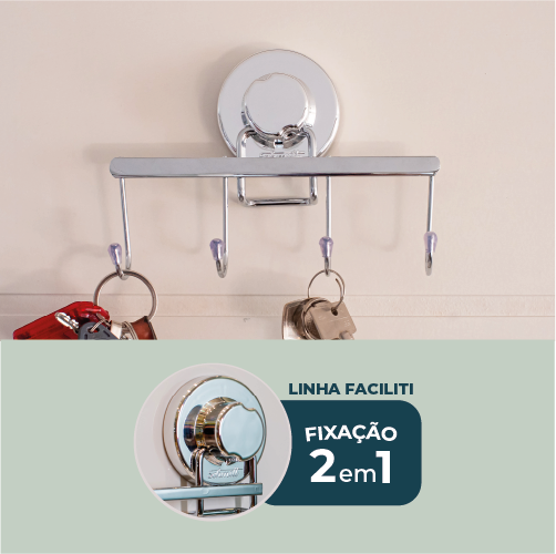 PORTA UTENSILIOS FACILITI COM VENTOSA é um item essencial para manter a organização da casa. Ele pode ser usado para armazenar objetos no closet, hall de entrada, área de serviço ou onde for necessário. Possui ponteira de silicone nos ganchos. A instalação é rápida, sem sujeira e dispensando o uso de ferramentas e furadeira.