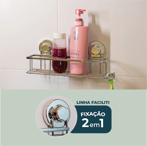 O Suporte para Shampoo Faciliti com Ventosa é perfeito para organizar os produtos usados no banheiro. A instalação é rápida, sem sujeira e dispensa o uso de ferramentas e furadeira.
