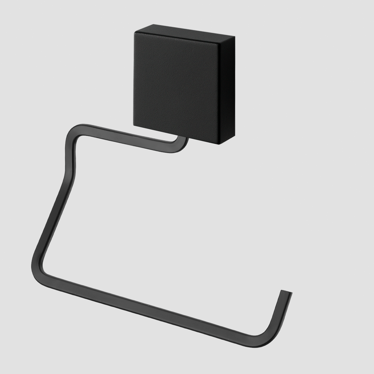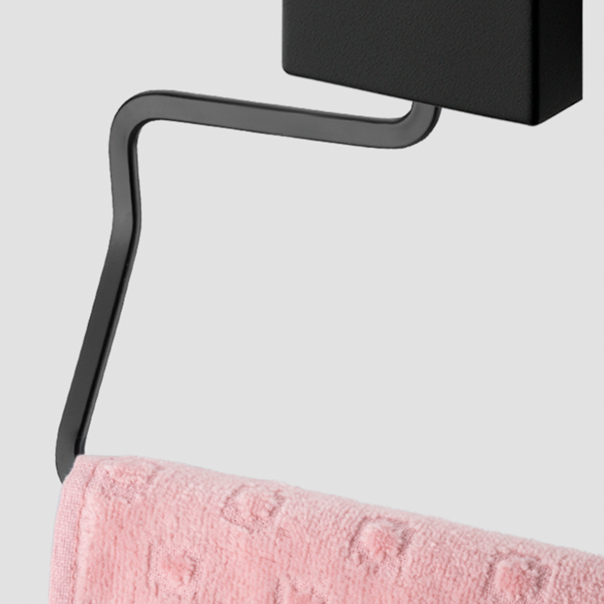 Toalheiro adesivo preto fosco para toalha de rosto, com fixação 3M sem furos na parede. Compacto, resistente à umidade e com acabamento elegante para banheiros modernos e funcionais.